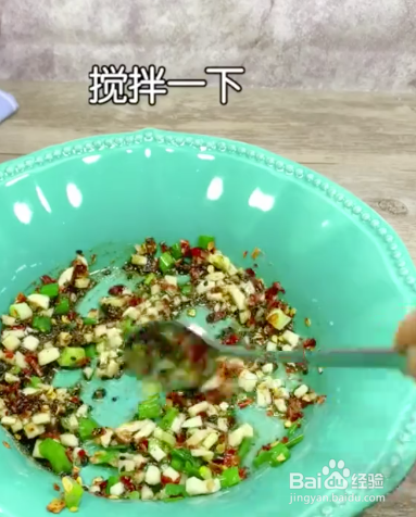 碗中放入蒜末、盐、鸡精、芝麻、辣椒面、花椒粉、葱花淋入热油,加生抽、白糖、陈醋拌匀。