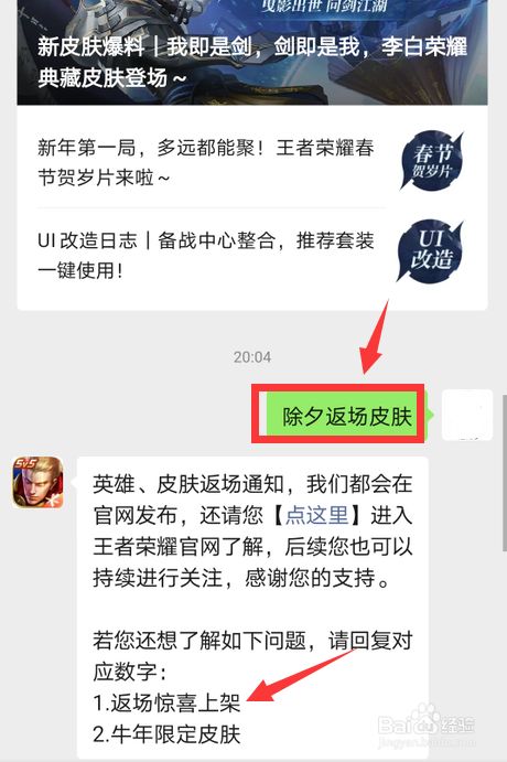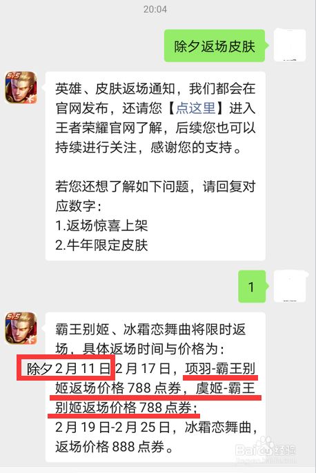 回复1后,即可查看除夕返场皮肤为项羽和虞姬的霸王别姬。