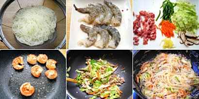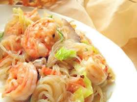 将粉丝和虾仁倒入锅中,加入所有料汁炒匀即可