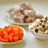 排骨焯水去血水,胡萝卜和香菇切成丁儿。。(为了让排骨入味,可以在焯水后用盐和料酒姜片腌渍半个小时,不过在烹制过程中这些调料就可以不用再加了)