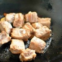 锅里放入少量橄榄油,放入姜片八角爆香后加入焯水后的排骨,放冰糖炒至表面微微发黄