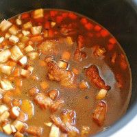加入酱油和老抽继续翻炒让排骨上色,加水没过排骨,再调入料酒和盐