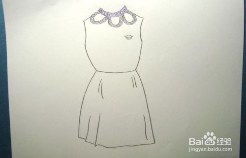 然后,用紫色彩铅笔给漂亮的无袖长裙的衣领装饰图形,涂上颜色,如下图所示。