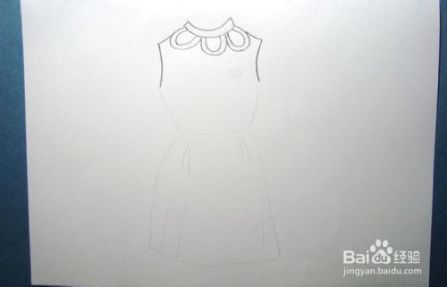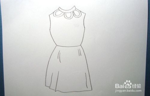 用铅笔在白纸上,画出漂亮的无袖长裙的草图,接着用黑色彩铅笔绘画出漂亮的无袖长裙的衣领图形部分,如下图所示。