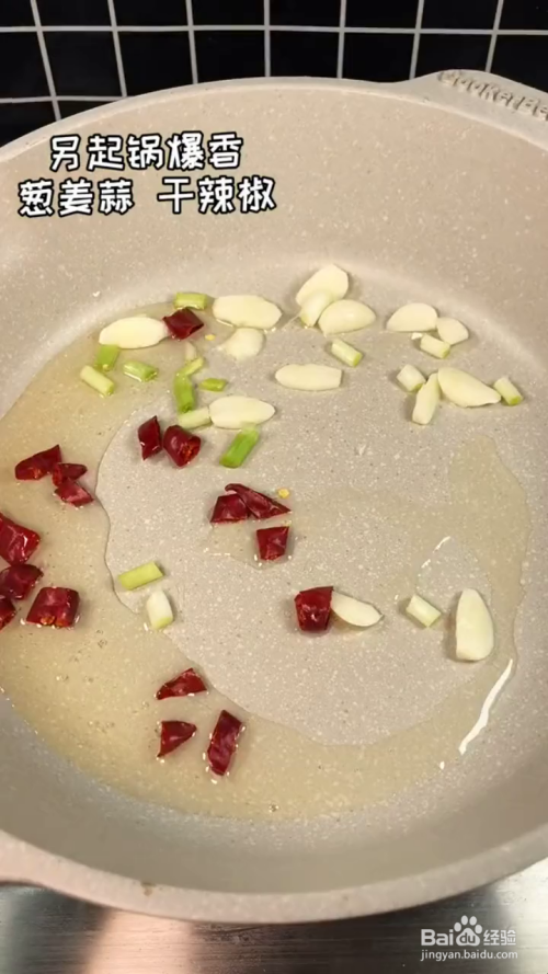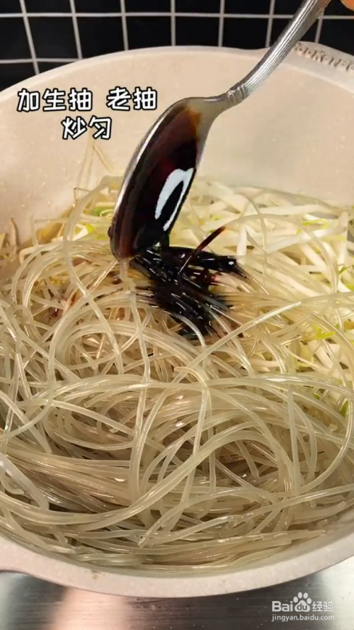 锅中再放油,加入葱姜蒜,干辣椒爆出香味,然后放入豆芽和粉条,生抽和老抽,炒至入味变软