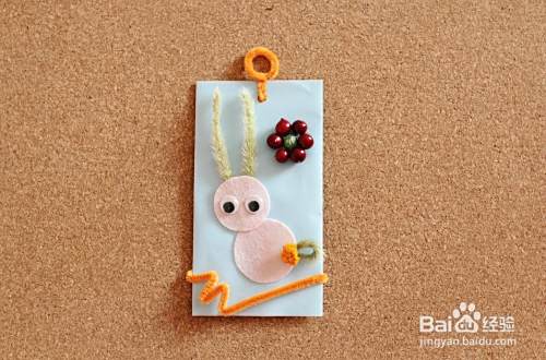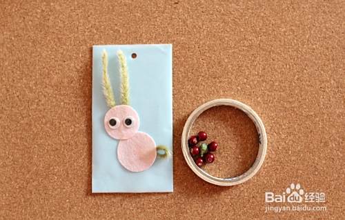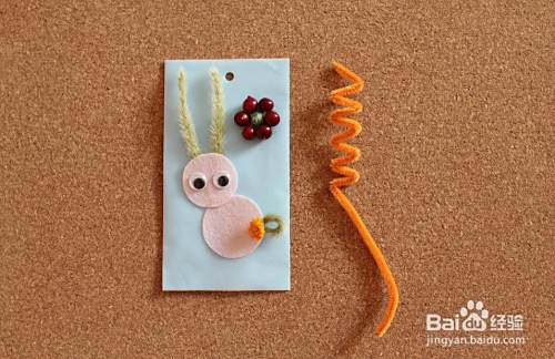 将z字形扭扭棒粘在卡纸的下半部,领取一小段扭扭棒,扭成圆形插入孔中固定。