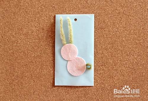 将等长的两根狗尾草作为兔兔的耳朵,用双面胶粘在小圆上部中心处的背面。将另一根狗尾草圈成圆形,粘在大圆的右侧背面。