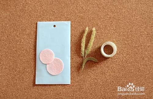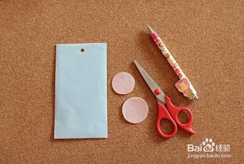 用打孔器在卡纸上部中心处打孔。用笔在粉色不织布上画出一大一小两个圆形,用剪刀剪下备用。