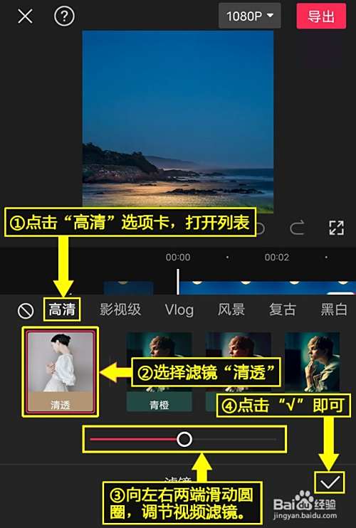 添加滤镜。点击“高清”选项卡,打开列表,选择滤镜“清透”,向左右两端滑动圆圈,调节视频滤镜,点击右下角的“√”即可。