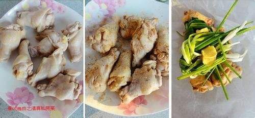 放入烤箱,50度,热风吹约20分钟,把鸡翅根表面风干,减少焗烤的时候有汁水淌出把锅底糊住。然后用少许料酒,擦拭鸡翅根,手上沾少许姜黄粉(除了上色还有一些香味),少许盐,五香粉,反复擦拭鸡翅根。将葱洗净挽成结,姜切片,放置在鸡翅根上。