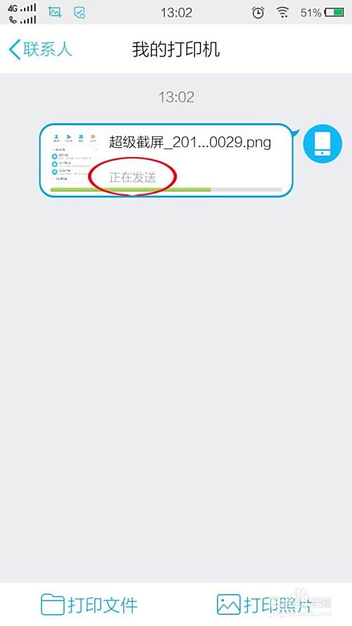 7.这时就将数据传输到打印机上了,上面显示发送状态了,上面显示“已发至打印机”,图片就打印出来了。如图