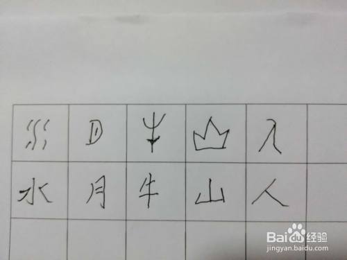 就是摹画实物形状造出来的字,使人一看字形就知道是什么。比如牛、山、人,等字的篆书、金文就很形象。象形字一般都是独体字,而不是合体字。如下图,月字就像一个月牙,牛字突出了牛犄角,水字就像小河流水的波纹。