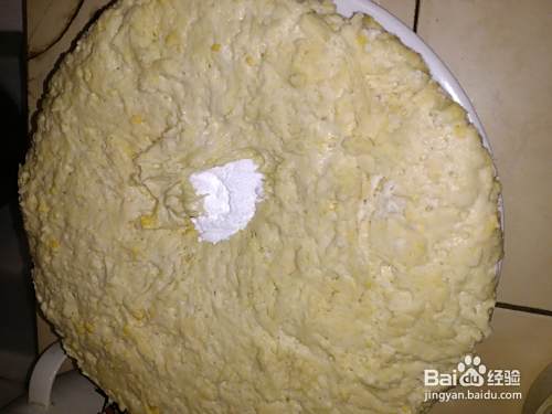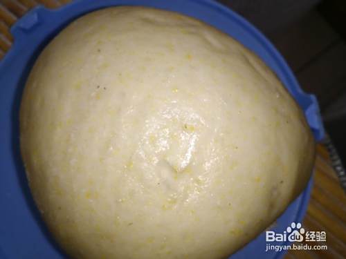 玉米面放入发面的盆中,这里选用的是厚瓷盆,保温效果好