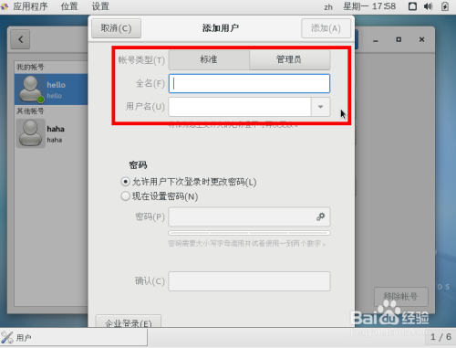 选择账户类型是标准还是管理员,以及用户名密码创建新的用户了。