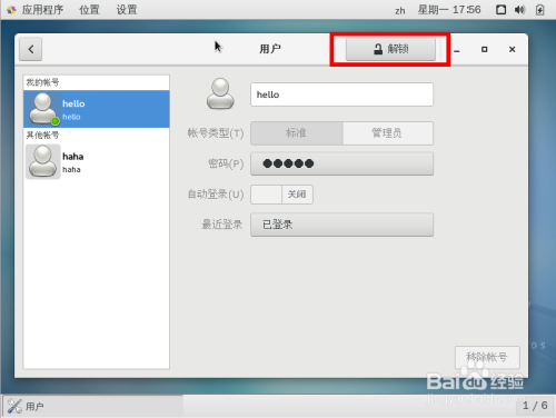 然后会列表系统中的用户,要管理需要点击顶部的”解锁“。