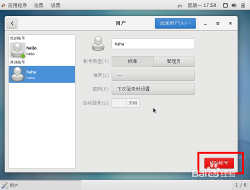 要删除用户可以选择用户,选择右下角的“移除账号”就可以了。