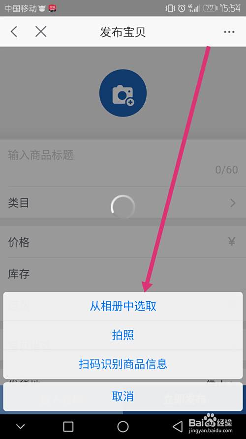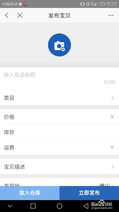 进入到宝贝发布的页面后,你会看到图上的样子,然后最上面添加图片是宝贝主图,只能添加五张,可以选择手机拍照,也可以选择手机里面已经有的照片。