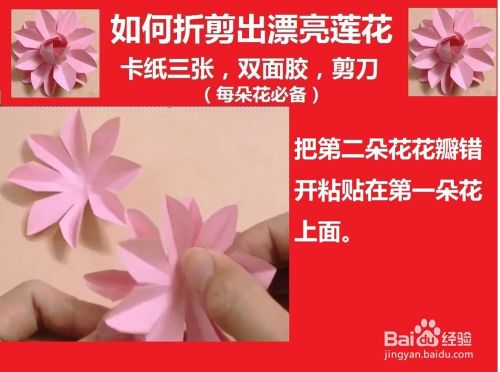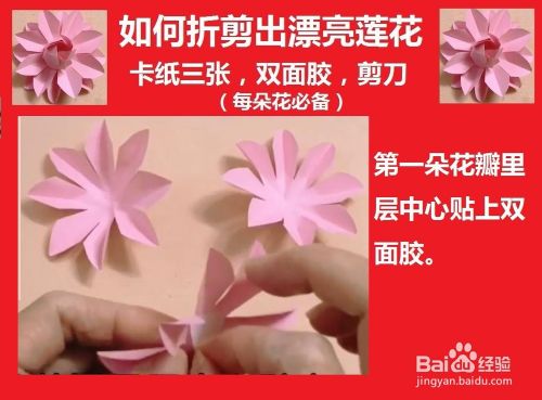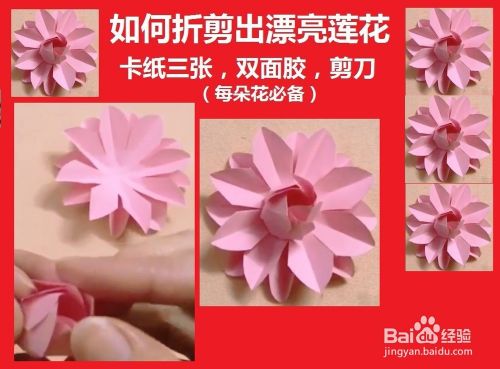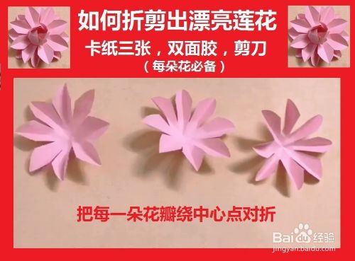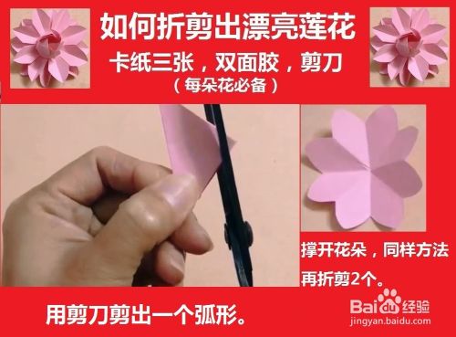 用三张粉红色的彩纸可通过折纸,剪纸,粘贴,合拢形成一朵漂亮的莲花。