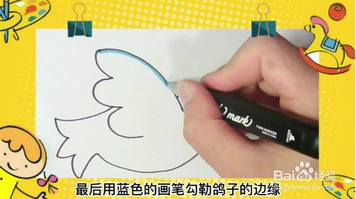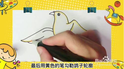 最后用黄色的笔勾勒鸽子轮廓,这样炯炯有神的鸽子就画好了。