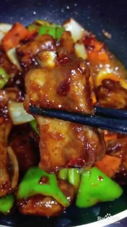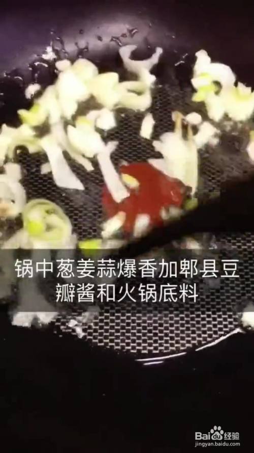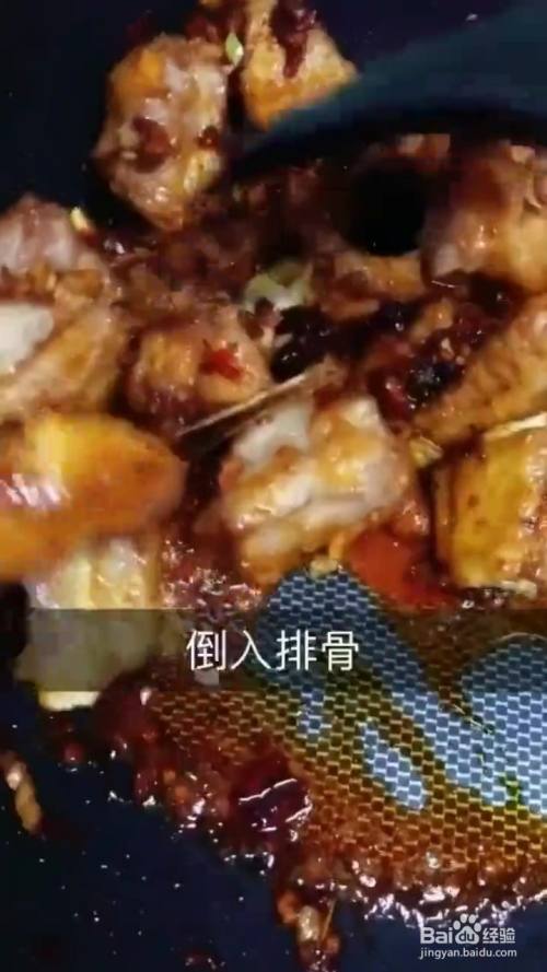 油温七成酱排骨炸熟捞出 锅中葱姜蒜炒香 放入豆瓣酱 火锅底料 倒入排骨