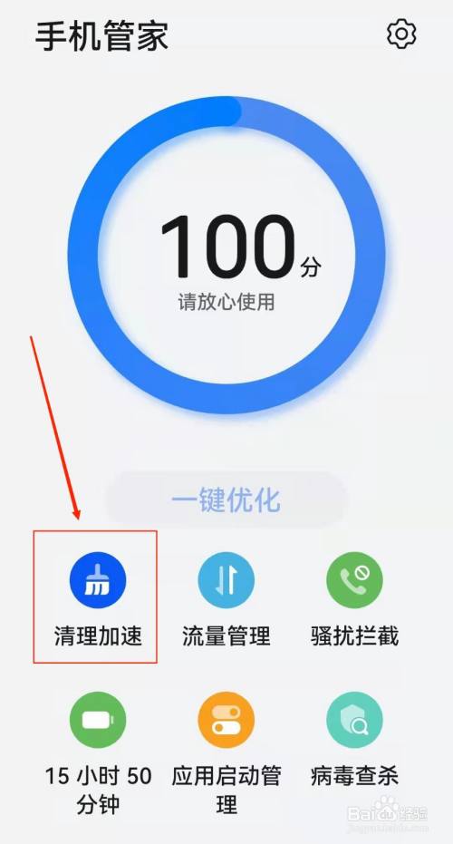 打开手机管家后,点击清理加速