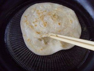 锅置火上少许油烧热,放入薄饼,中小火烙制;当饼的中间鼓起来时,迅速用筷子将鼓起的部分扎破,形成一个小口。