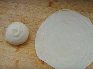 卷好后,将面团立起,用手掌从上往下按平,然后用擀面杖擀成薄饼。