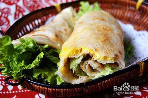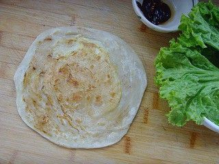 烙好的鸡蛋饼抹上甜面酱(辣椒酱),卷上生菜即可享用。