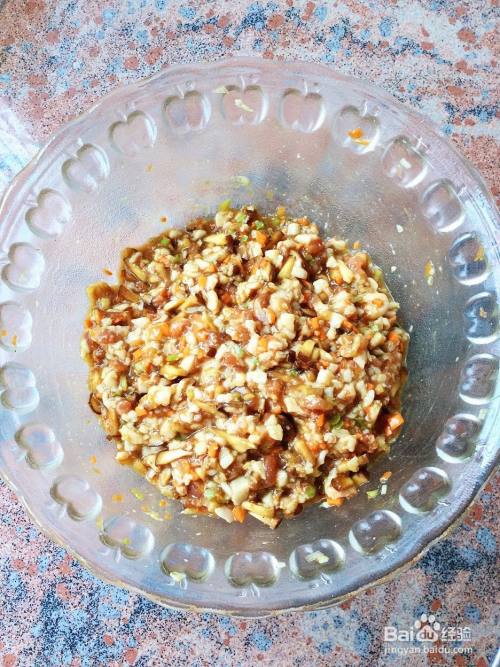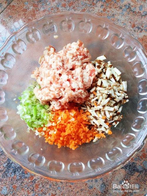 五花肉切丁,香菇切碎,胡萝卜切碎,葱姜切碎