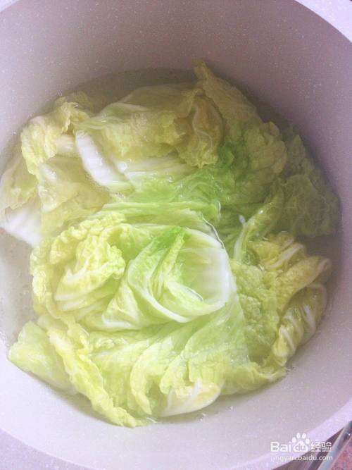 锅中烧开水白菜叶焯烫30秒,用凉水浸泡一下