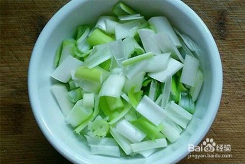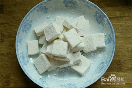 豆腐切方块,放入盐水中泡10分钟,去豆腥味和防碎。如图
