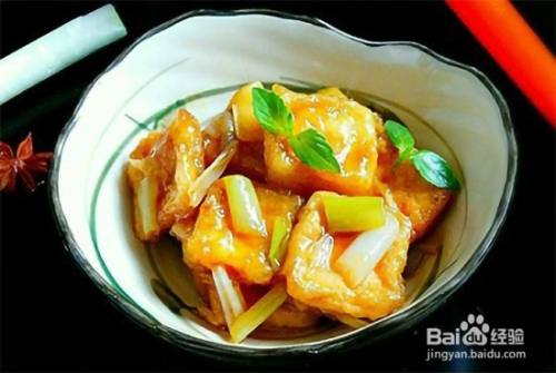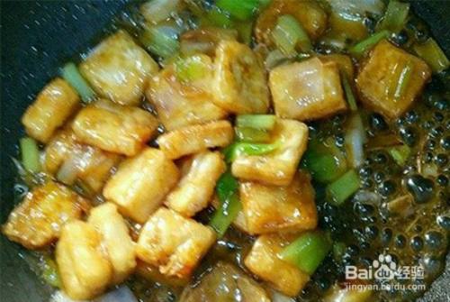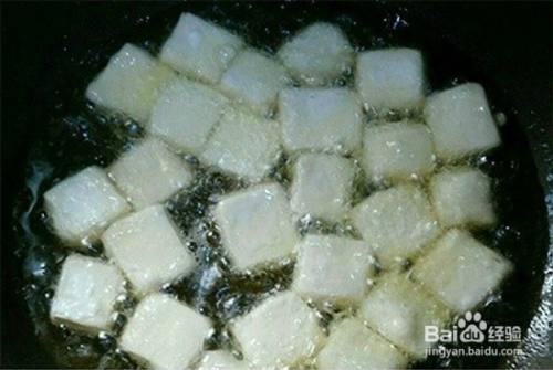 锅中倒油烧热,倒入豆腐块炸至两面金黄。如图