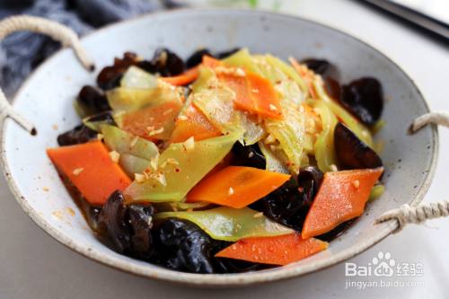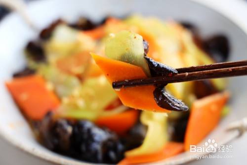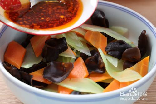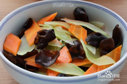 3、切好的莴笋和胡萝卜开水煮1分钟,捞出过凉开水,再把泡发的木耳也过下开水,全部捞出沥干水分放在大碗中;