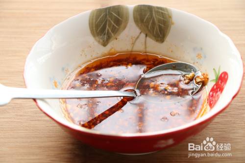 2、调个酱汁:大蒜切末放入碗中,加入1勺辣椒面,浇一勺热油,加入生抽、香醋、香油、辣椒油搅拌均匀;