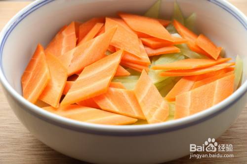 1、先把莴笋和胡萝卜去皮后斜刀切成段,再切成薄片;