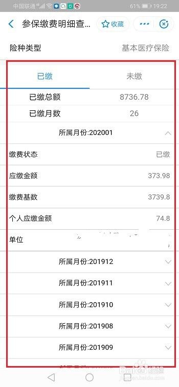 第五步点击基本医疗保险进去,可以看到医保缴费明细,每月个人缴纳多少,单位缴纳多少,也可以看下大额医疗保险,一般缴纳的比较少