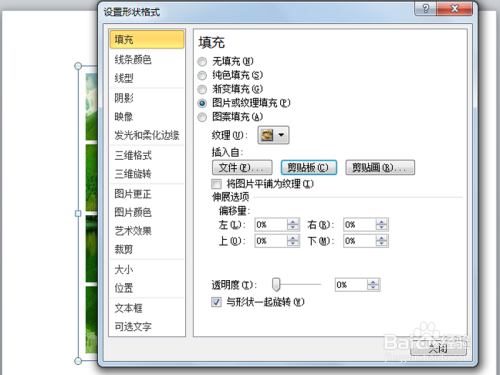 右键单击形状,从下拉菜单中选择设置形状格式选择,接着设置图片或纹理填充,点击剪贴板,点击关闭按钮。