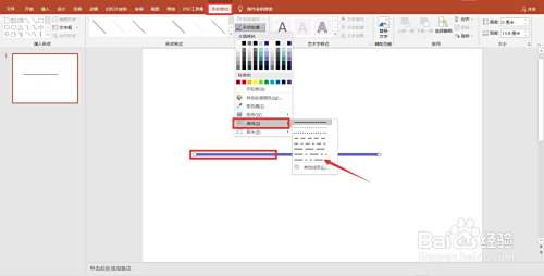 打开ppt软件并在新建的幻灯片中插入一根直线。选中直线并点击菜单栏中的形状格式选项,点击下方的形状轮廓下拉表,在弹出的选项中选择虚线下拉表,在弹出的选项中选中合适的虚线样式,幻灯片中的虚线就插入完成了。