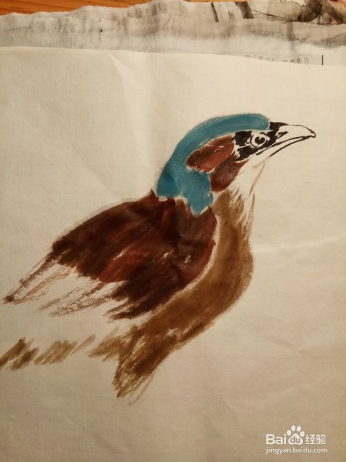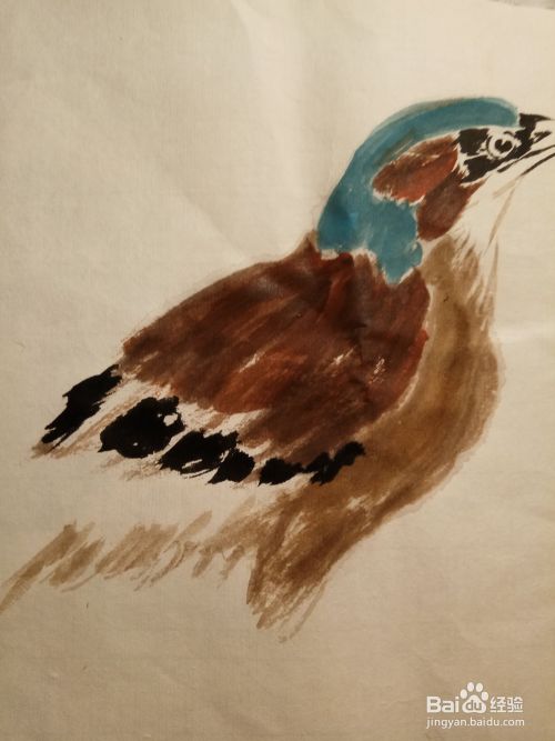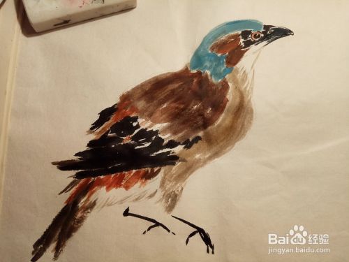 最后调浓墨,画伯劳鸟的足,然后用花青调少许的墨,染伯劳鸟的嘴部,这样一只伯劳鸟就画好了。