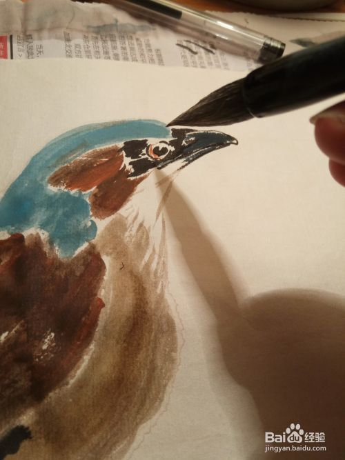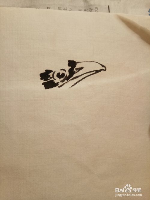 首先画伯劳鸟的眼睛及嘴,伯劳鸟的嘴前有钩,颜色黑,所以在画的时候,最前面要略有一个小勾,由这一点也可以看出,它是一种食肉型禽鸟,很凶猛,眼睛周围为黑色,用浓墨点出,