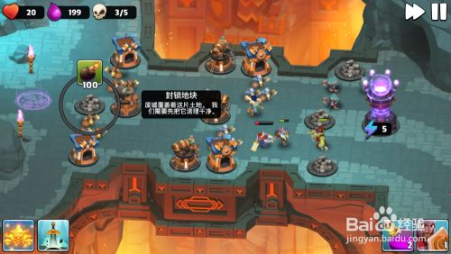 守卫城堡Castle Creeps的封锁地块,在第三章的时候会出现,封锁地块,占据着我们建造防御塔的位置,因此必须消除,那么怎么消除呢!大家可以参考小编的本篇经验。