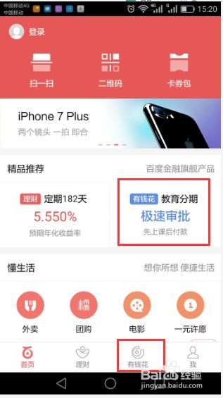 打开“百度钱包”APP,有2种方法可以进入“百度有钱花”贷款页面: