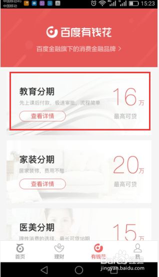 二、点击子菜单栏“有钱花”进入“百度有钱花”页面,然后点击“教育分期”进入;