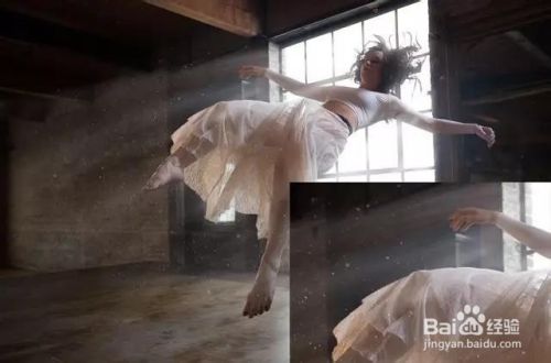 把人的下半身用钢笔工具扣出来,因为这张图模特脚的部分构图比较好,而且有悬浮感,所以被挑选出来了。技巧没有,多点耐心,边缘部分,适当模糊1-2个像素,增加融合感~