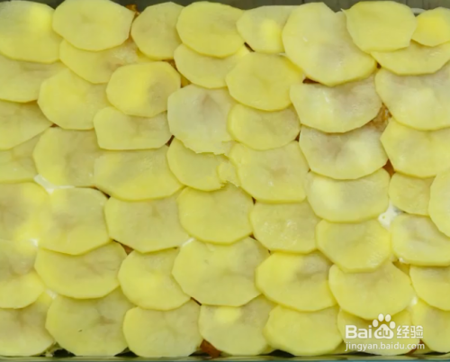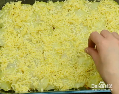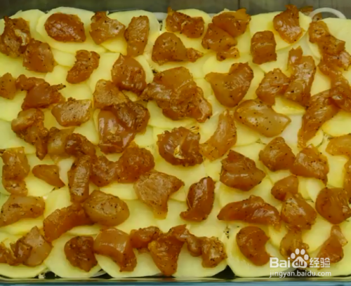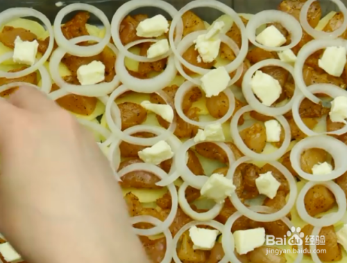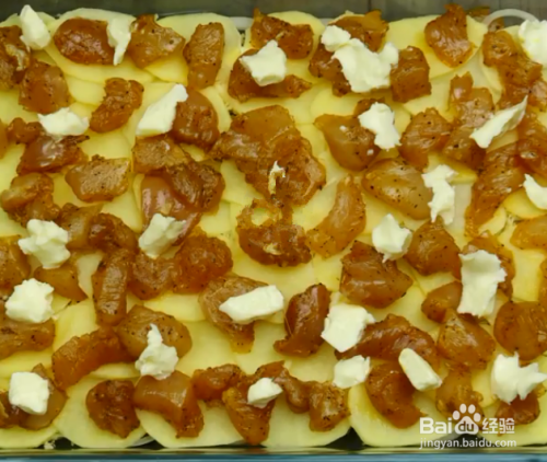 加入1/3的土豆片,撒上腌好的1/2鸡肉粒、黄油,加入1/2的切圈的洋葱,然后撒入奶酪条,(其实重复一次步骤2) 最后铺上剩余的土豆片。