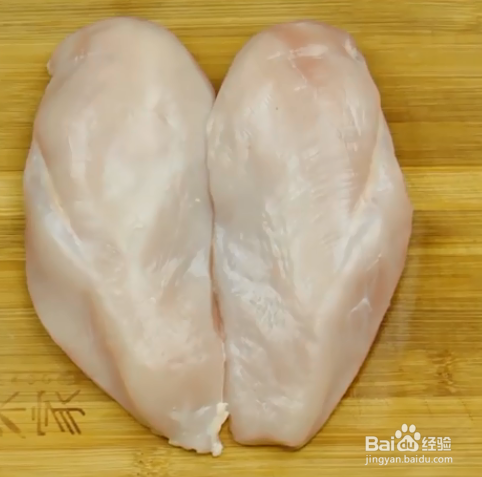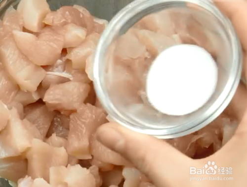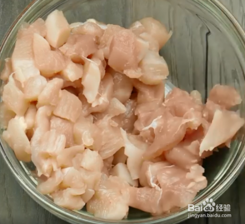 鸡胸肉切粒后装进一个碗里,加入盐、黑红胡椒粉、咖喱粉、橄榄油后搅匀腌5分钟。