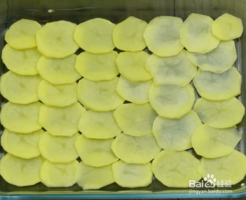 土豆去皮切片,把1/3的土豆片铺在模具底上,撒上腌好的1/2鸡肉粒,加入1/2的切圈的洋葱,然后撒入奶酪条、黄油。
