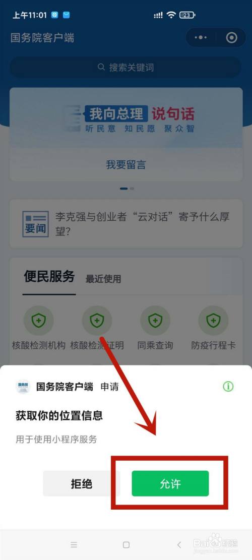 3.点击允许,再点击进入页面的防疫行程卡选项。