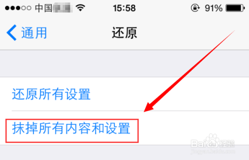 我们依次打开手机【设置】-【通用】-【还原】,点击选择【抹掉所有内容和设置】选项,将手机还原。如下图所示。