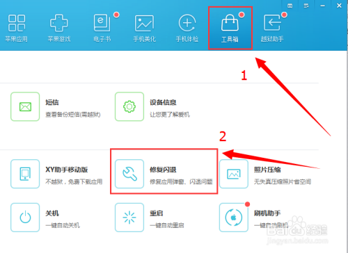 打开苹果助手,在主界面的右上角单击【工具箱】按钮,然后在页面中单击【闪退修复】选项。如下图所示。
